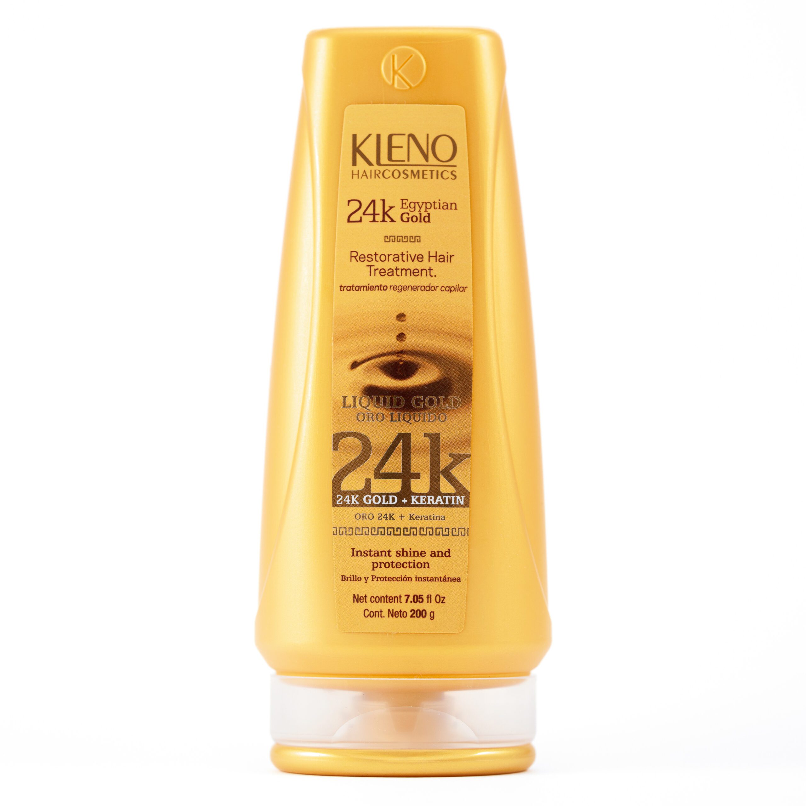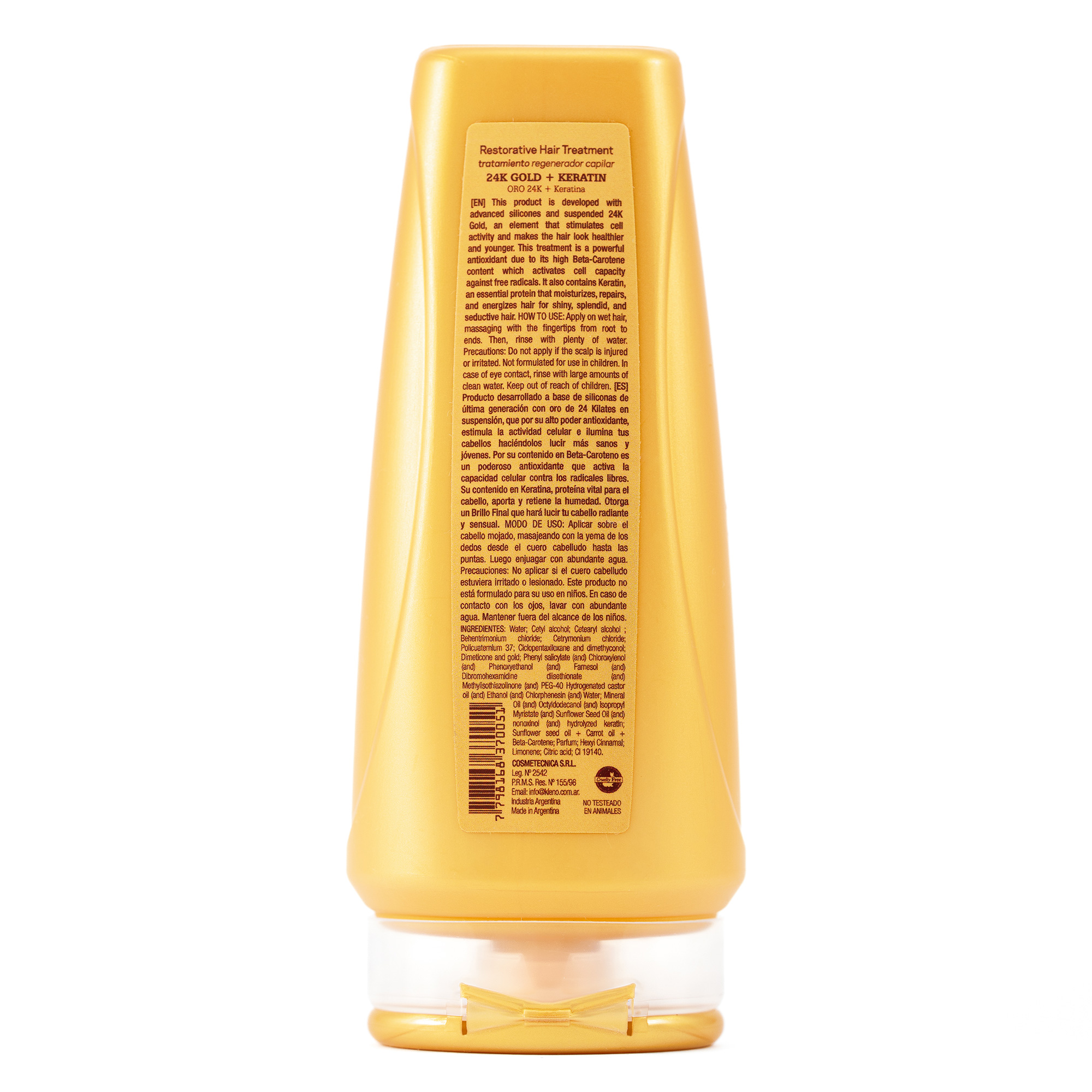 Restorative Hair Treatment is developed with advanced silicones and suspended 24K Gold, an element that stimulates cell activity and makes the hair look healthier and younger. This treatment is a powerful antioxidant due to its high Beta-Carotene content which activates cell capacity against free radicals. It also contains Keratin, an essential protein that moisturizes, repairs, and energizes hair for shiny, splendid, and seductive hair